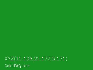 XYZ 11.106,21.177,5.171 Color is a normal green color and the nearest color is Forest Green #228b22. Hex code #179324 and RGB value is rgb(23,147,36). In RGB color space, this color is composed of 9% red, 58% green, 14% blue, In CMYK color space, this color is composed of 84% cyan, 0% magenta, 76% yellow , 42% black , In HSL color space, this color has a hue angle of 126° , 73% saturation and 33% lightness.
