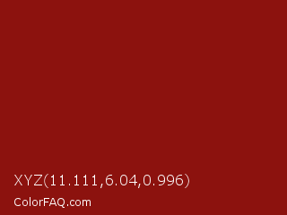 XYZ 11.111,6.04,0.996 Color is a dark red color and the nearest color is Tamarillo #991613. Hex code #8c120e and RGB value is rgb(140,18,14). In RGB color space, this color is composed of 55% red, 7% green, 5% blue, In CMYK color space, this color is composed of 0% cyan, 87% magenta, 90% yellow , 45% black , In HSL color space, this color has a hue angle of 2° , 82% saturation and 30% lightness.