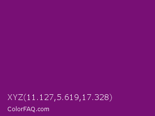 XYZ 11.127,5.619,17.328 Color is a dark magenta color and the nearest color is Patriarch #800080. Hex code #780f75 and RGB value is rgb(120,15,117). In RGB color space, this color is composed of 47% red, 6% green, 46% blue, In CMYK color space, this color is composed of 0% cyan, 88% magenta, 3% yellow , 53% black , In HSL color space, this color has a hue angle of 302° , 78% saturation and 26% lightness.