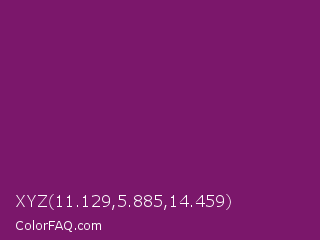 XYZ 11.129,5.885,14.459 Color is a dark magenta color and the nearest color is Midnight #702670. Hex code #7b176b and RGB value is rgb(123,23,107). In RGB color space, this color is composed of 48% red, 9% green, 42% blue, In CMYK color space, this color is composed of 0% cyan, 81% magenta, 13% yellow , 52% black , In HSL color space, this color has a hue angle of 310° , 68% saturation and 29% lightness.