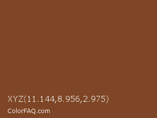 XYZ 11.144,8.956,2.975 Color is a normal orange color and the nearest color is Nutmeg #81422c. Hex code #7e4626 and RGB value is rgb(126,70,38). In RGB color space, this color is composed of 49% red, 27% green, 15% blue, In CMYK color space, this color is composed of 0% cyan, 44% magenta, 70% yellow , 51% black , In HSL color space, this color has a hue angle of 22° , 54% saturation and 32% lightness.