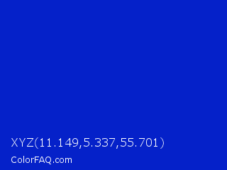 XYZ 11.149,5.337,55.701 Color is a normal blue color and the nearest color is Dark Blue #0000c8. Hex code #0521c9 and RGB value is rgb(5,33,201). In RGB color space, this color is composed of 2% red, 13% green, 79% blue, In CMYK color space, this color is composed of 98% cyan, 84% magenta, 0% yellow , 21% black , In HSL color space, this color has a hue angle of 231° , 95% saturation and 40% lightness.