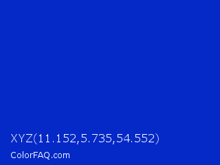 XYZ 11.152,5.735,54.552 Color is a normal blue color and the nearest color is UA Blue #0033aa. Hex code #0429c7 and RGB value is rgb(4,41,199). In RGB color space, this color is composed of 2% red, 16% green, 78% blue, In CMYK color space, this color is composed of 98% cyan, 79% magenta, 0% yellow , 22% black , In HSL color space, this color has a hue angle of 229° , 96% saturation and 40% lightness.