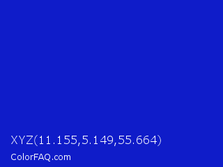 XYZ 11.155,5.149,55.664 Color is a normal blue color and the nearest color is Dark Blue #0000c8. Hex code #0f1cc9 and RGB value is rgb(15,28,201). In RGB color space, this color is composed of 6% red, 11% green, 79% blue, In CMYK color space, this color is composed of 93% cyan, 86% magenta, 0% yellow , 21% black , In HSL color space, this color has a hue angle of 236° , 86% saturation and 42% lightness.