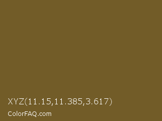 XYZ 11.15,11.385,3.617 Color is a dark orange color and the nearest color is Field Drab #6c541e. Hex code #725c28 and RGB value is rgb(114,92,40). In RGB color space, this color is composed of 45% red, 36% green, 16% blue, In CMYK color space, this color is composed of 0% cyan, 19% magenta, 65% yellow , 55% black , In HSL color space, this color has a hue angle of 42° , 48% saturation and 30% lightness.