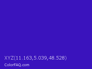 XYZ 11.163,5.039,48.528 Color is a normal indigo color and the nearest color is Interdimensional Blue #360ccc. Hex code #3a13bd and RGB value is rgb(58,19,189). In RGB color space, this color is composed of 23% red, 7% green, 74% blue, In CMYK color space, this color is composed of 69% cyan, 90% magenta, 0% yellow , 26% black , In HSL color space, this color has a hue angle of 254° , 82% saturation and 41% lightness.
