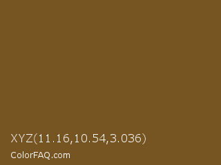 XYZ 11.16,10.54,3.036 Color is a dark orange color and the nearest color is Field Drab #6c541e. Hex code #775523 and RGB value is rgb(119,85,35). In RGB color space, this color is composed of 47% red, 33% green, 14% blue, In CMYK color space, this color is composed of 0% cyan, 29% magenta, 71% yellow , 53% black , In HSL color space, this color has a hue angle of 36° , 55% saturation and 30% lightness.
