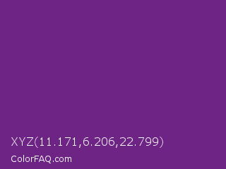 XYZ 11.171,6.206,22.799 Color is a normal purple color and the nearest color is Eminence #6c3082. Hex code #6d2485 and RGB value is rgb(109,36,133). In RGB color space, this color is composed of 43% red, 14% green, 52% blue, In CMYK color space, this color is composed of 18% cyan, 73% magenta, 0% yellow , 48% black , In HSL color space, this color has a hue angle of 285° , 57% saturation and 33% lightness.