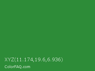 XYZ 11.174,19.6,6.936 Color is a normal green color and the nearest color is Forest Green #228b22. Hex code #2d8c38 and RGB value is rgb(45,140,56). In RGB color space, this color is composed of 18% red, 55% green, 22% blue, In CMYK color space, this color is composed of 68% cyan, 0% magenta, 60% yellow , 45% black , In HSL color space, this color has a hue angle of 127° , 51% saturation and 36% lightness.