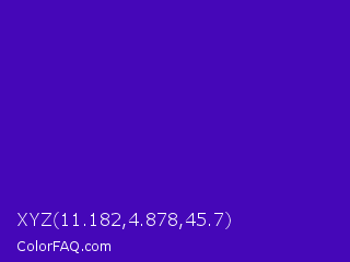 XYZ 11.182,4.878,45.7 Color is a normal violet color and the nearest color is Interdimensional Blue #360ccc. Hex code #4507b8 and RGB value is rgb(69,7,184). In RGB color space, this color is composed of 27% red, 3% green, 72% blue, In CMYK color space, this color is composed of 63% cyan, 96% magenta, 0% yellow , 28% black , In HSL color space, this color has a hue angle of 261° , 93% saturation and 37% lightness.