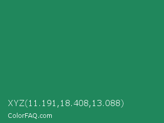 XYZ 11.191,18.408,13.088 Color is a normal green color and the nearest color is Eucalyptus #278a5b. Hex code #20875c and RGB value is rgb(32,135,92). In RGB color space, this color is composed of 13% red, 53% green, 36% blue, In CMYK color space, this color is composed of 76% cyan, 0% magenta, 32% yellow , 47% black , In HSL color space, this color has a hue angle of 155° , 62% saturation and 33% lightness.