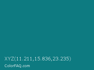 XYZ 11.211,15.836,23.235 Color is a dark cyan color and the nearest color is Surfie Green #0c7a79. Hex code #0d7b81 and RGB value is rgb(13,123,129). In RGB color space, this color is composed of 5% red, 48% green, 51% blue, In CMYK color space, this color is composed of 90% cyan, 5% magenta, 0% yellow , 49% black , In HSL color space, this color has a hue angle of 183° , 82% saturation and 28% lightness.