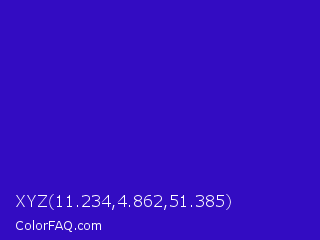 XYZ 11.234,4.862,51.385 Color is a normal indigo color and the nearest color is Interdimensional Blue #360ccc. Hex code #330cc2 and RGB value is rgb(51,12,194). In RGB color space, this color is composed of 20% red, 5% green, 76% blue, In CMYK color space, this color is composed of 74% cyan, 94% magenta, 0% yellow , 24% black , In HSL color space, this color has a hue angle of 253° , 88% saturation and 40% lightness.