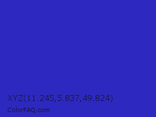 XYZ 11.245,5.837,49.824 Color is a normal indigo color and the nearest color is Governor Bay #2f3cb3. Hex code #2d28bf and RGB value is rgb(45,40,191). In RGB color space, this color is composed of 18% red, 16% green, 75% blue, In CMYK color space, this color is composed of 76% cyan, 79% magenta, 0% yellow , 25% black , In HSL color space, this color has a hue angle of 242° , 65% saturation and 45% lightness.