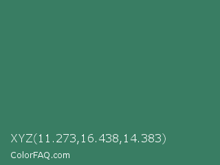 XYZ 11.273,16.438,14.383 Color is a normal green color and the nearest color is Amazon #3b7a57. Hex code #397d63 and RGB value is rgb(57,125,99). In RGB color space, this color is composed of 22% red, 49% green, 39% blue, In CMYK color space, this color is composed of 54% cyan, 0% magenta, 21% yellow , 51% black , In HSL color space, this color has a hue angle of 157° , 37% saturation and 36% lightness.
