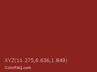 XYZ 11.275,6.636,1.849 Color is a normal red color and the nearest color is Old Brick #901e1e. Hex code #8a221d and RGB value is rgb(138,34,29). In RGB color space, this color is composed of 54% red, 13% green, 11% blue, In CMYK color space, this color is composed of 0% cyan, 75% magenta, 79% yellow , 46% black , In HSL color space, this color has a hue angle of 3° , 65% saturation and 33% lightness.