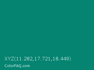XYZ 11.282,17.721,18.449 Color is a dark cyan color and the nearest color is Observatory #02866f. Hex code #048471 and RGB value is rgb(4,132,113). In RGB color space, this color is composed of 2% red, 52% green, 44% blue, In CMYK color space, this color is composed of 97% cyan, 0% magenta, 14% yellow , 48% black , In HSL color space, this color has a hue angle of 171° , 94% saturation and 27% lightness.