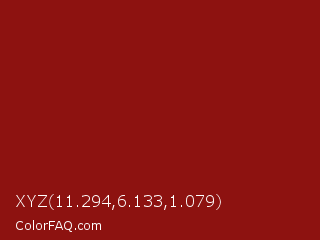 XYZ 11.294,6.133,1.079 Color is a normal red color and the nearest color is Tamarillo #991613. Hex code #8d1210 and RGB value is rgb(141,18,16). In RGB color space, this color is composed of 55% red, 7% green, 6% blue, In CMYK color space, this color is composed of 0% cyan, 87% magenta, 89% yellow , 45% black , In HSL color space, this color has a hue angle of 1° , 80% saturation and 31% lightness.