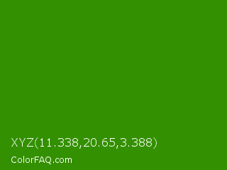 XYZ 11.338,20.65,3.388 Color is a dark green color and the nearest color is Napier Green #2a8000. Hex code #339000 and RGB value is rgb(51,144,0). In RGB color space, this color is composed of 20% red, 56% green, 0% blue, In CMYK color space, this color is composed of 65% cyan, 0% magenta, 100% yellow , 44% black , In HSL color space, this color has a hue angle of 99° , 100% saturation and 28% lightness.