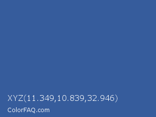 XYZ 11.349,10.839,32.946 Color is a normal blue color and the nearest color is Azure #315ba1. Hex code #365c9c and RGB value is rgb(54,92,156). In RGB color space, this color is composed of 21% red, 36% green, 61% blue, In CMYK color space, this color is composed of 65% cyan, 41% magenta, 0% yellow , 39% black , In HSL color space, this color has a hue angle of 218° , 49% saturation and 41% lightness.