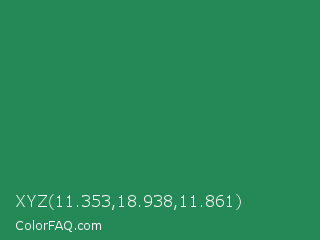 XYZ 11.353,18.938,11.861 Color is a normal green color and the nearest color is Eucalyptus #278a5b. Hex code #248956 and RGB value is rgb(36,137,86). In RGB color space, this color is composed of 14% red, 54% green, 34% blue, In CMYK color space, this color is composed of 74% cyan, 0% magenta, 37% yellow , 46% black , In HSL color space, this color has a hue angle of 150° , 58% saturation and 34% lightness.