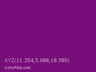 XYZ 11.354,5.688,18.589 Color is a dark magenta color and the nearest color is Patriarch #800080. Hex code #780e79 and RGB value is rgb(120,14,121). In RGB color space, this color is composed of 47% red, 5% green, 47% blue, In CMYK color space, this color is composed of 1% cyan, 88% magenta, 0% yellow , 53% black , In HSL color space, this color has a hue angle of 299° , 79% saturation and 26% lightness.
