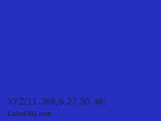 XYZ 11.368,6.27,50.48 Color is a normal blue color and the nearest color is Persian Blue #1c39bb. Hex code #272fc0 and RGB value is rgb(39,47,192). In RGB color space, this color is composed of 15% red, 18% green, 75% blue, In CMYK color space, this color is composed of 80% cyan, 76% magenta, 0% yellow , 25% black , In HSL color space, this color has a hue angle of 237° , 66% saturation and 45% lightness.