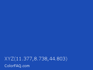 XYZ 11.377,8.738,44.803 Color is a normal blue color and the nearest color is Denim Blue #2243b6. Hex code #1b4cb5 and RGB value is rgb(27,76,181). In RGB color space, this color is composed of 11% red, 30% green, 71% blue, In CMYK color space, this color is composed of 85% cyan, 58% magenta, 0% yellow , 29% black , In HSL color space, this color has a hue angle of 221° , 74% saturation and 41% lightness.