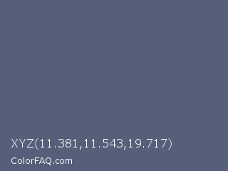 XYZ 11.381,11.543,19.717 Color is a normal blue color and the nearest color is Comet #5c5d75. Hex code #565f79 and RGB value is rgb(86,95,121). In RGB color space, this color is composed of 34% red, 37% green, 47% blue, In CMYK color space, this color is composed of 29% cyan, 21% magenta, 0% yellow , 53% black , In HSL color space, this color has a hue angle of 225° , 17% saturation and 41% lightness.