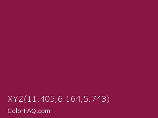 XYZ 11.405,6.164,5.743 Color is a normal rose color and the nearest color is Rose Bud Cherry #800b47. Hex code #881542 and RGB value is rgb(136,21,66). In RGB color space, this color is composed of 53% red, 8% green, 26% blue, In CMYK color space, this color is composed of 0% cyan, 85% magenta, 51% yellow , 47% black , In HSL color space, this color has a hue angle of 337° , 73% saturation and 31% lightness.
