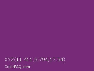 XYZ 11.411,6.794,17.54 Color is a normal magenta color and the nearest color is Midnight #702670. Hex code #752b75 and RGB value is rgb(117,43,117). In RGB color space, this color is composed of 46% red, 17% green, 46% blue, In CMYK color space, this color is composed of 0% cyan, 63% magenta, 0% yellow , 54% black , In HSL color space, this color has a hue angle of 300° , 46% saturation and 31% lightness.