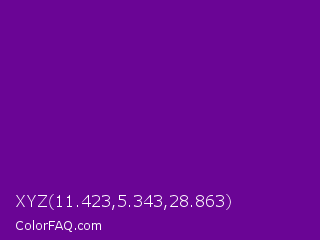 XYZ 11.423,5.343,28.863 Color is a dark purple color and the nearest color is Purple #660099. Hex code #6a0595 and RGB value is rgb(106,5,149). In RGB color space, this color is composed of 42% red, 2% green, 58% blue, In CMYK color space, this color is composed of 29% cyan, 97% magenta, 0% yellow , 42% black , In HSL color space, this color has a hue angle of 282° , 94% saturation and 30% lightness.