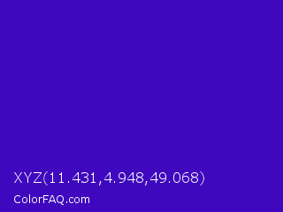 XYZ 11.431,4.948,49.068 Color is a normal indigo color and the nearest color is Interdimensional Blue #360ccc. Hex code #3f08be and RGB value is rgb(63,8,190). In RGB color space, this color is composed of 25% red, 3% green, 75% blue, In CMYK color space, this color is composed of 67% cyan, 96% magenta, 0% yellow , 25% black , In HSL color space, this color has a hue angle of 258° , 92% saturation and 39% lightness.