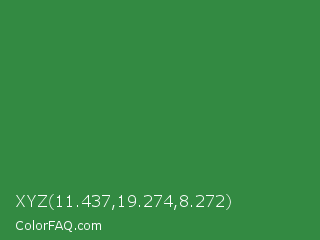 XYZ 11.437,19.274,8.272 Color is a normal green color and the nearest color is Sea Green #2e8b57. Hex code #338a42 and RGB value is rgb(51,138,66). In RGB color space, this color is composed of 20% red, 54% green, 26% blue, In CMYK color space, this color is composed of 63% cyan, 0% magenta, 52% yellow , 46% black , In HSL color space, this color has a hue angle of 130° , 46% saturation and 37% lightness.
