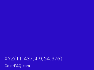 XYZ 11.437,4.9,54.376 Color is a normal indigo color and the nearest color is Interdimensional Blue #360ccc. Hex code #2b0cc7 and RGB value is rgb(43,12,199). In RGB color space, this color is composed of 17% red, 5% green, 78% blue, In CMYK color space, this color is composed of 78% cyan, 94% magenta, 0% yellow , 22% black , In HSL color space, this color has a hue angle of 250° , 89% saturation and 41% lightness.