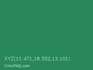 XYZ 11.471,18.552,13.101 Color is a normal green color and the nearest color is Eucalyptus #278a5b. Hex code #28875c and RGB value is rgb(40,135,92). In RGB color space, this color is composed of 16% red, 53% green, 36% blue, In CMYK color space, this color is composed of 70% cyan, 0% magenta, 32% yellow , 47% black , In HSL color space, this color has a hue angle of 153° , 54% saturation and 34% lightness.
