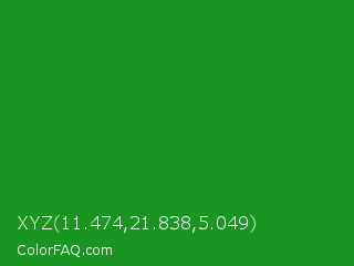 XYZ 11.474,21.838,5.049 Color is a normal green color and the nearest color is Forest Green #228b22. Hex code #1b9521 and RGB value is rgb(27,149,33). In RGB color space, this color is composed of 11% red, 58% green, 13% blue, In CMYK color space, this color is composed of 82% cyan, 0% magenta, 78% yellow , 42% black , In HSL color space, this color has a hue angle of 123° , 69% saturation and 35% lightness.