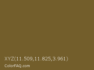 XYZ 11.509,11.825,3.961 Color is a normal orange color and the nearest color is Yellow Metal #716338. Hex code #735e2b and RGB value is rgb(115,94,43). In RGB color space, this color is composed of 45% red, 37% green, 17% blue, In CMYK color space, this color is composed of 0% cyan, 18% magenta, 63% yellow , 55% black , In HSL color space, this color has a hue angle of 43° , 46% saturation and 31% lightness.