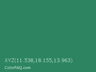 XYZ 11.538,18.155,13.963 Color is a normal green color and the nearest color is Eucalyptus #278a5b. Hex code #2c8560 and RGB value is rgb(44,133,96). In RGB color space, this color is composed of 17% red, 52% green, 38% blue, In CMYK color space, this color is composed of 67% cyan, 0% magenta, 28% yellow , 48% black , In HSL color space, this color has a hue angle of 155° , 50% saturation and 35% lightness.