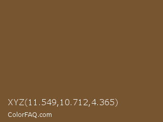 XYZ 11.549,10.712,4.365 Color is a normal orange color and the nearest color is Old Copper #724a2f. Hex code #785531 and RGB value is rgb(120,85,49). In RGB color space, this color is composed of 47% red, 33% green, 19% blue, In CMYK color space, this color is composed of 0% cyan, 29% magenta, 59% yellow , 53% black , In HSL color space, this color has a hue angle of 30° , 42% saturation and 33% lightness.