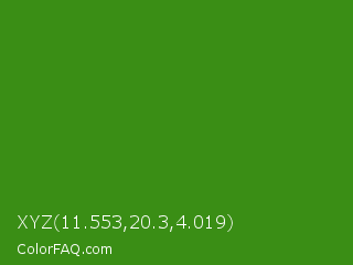XYZ 11.553,20.3,4.019 Color is a normal green color and the nearest color is La Palma #368716. Hex code #3a8e15 and RGB value is rgb(58,142,21). In RGB color space, this color is composed of 23% red, 56% green, 8% blue, In CMYK color space, this color is composed of 59% cyan, 0% magenta, 85% yellow , 44% black , In HSL color space, this color has a hue angle of 102° , 74% saturation and 32% lightness.