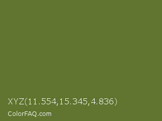 XYZ 11.554,15.345,4.836 Color is a normal lime color and the nearest color is Dark Olive Green #556b2f. Hex code #5f752d and RGB value is rgb(95,117,45). In RGB color space, this color is composed of 37% red, 46% green, 18% blue, In CMYK color space, this color is composed of 19% cyan, 0% magenta, 62% yellow , 54% black , In HSL color space, this color has a hue angle of 78° , 44% saturation and 32% lightness.
