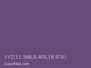 XYZ 11.568,9.409,18.976 Color is a normal purple color and the nearest color is Smoky #605b73. Hex code #674c78 and RGB value is rgb(103,76,120). In RGB color space, this color is composed of 40% red, 30% green, 47% blue, In CMYK color space, this color is composed of 14% cyan, 37% magenta, 0% yellow , 53% black , In HSL color space, this color has a hue angle of 277° , 22% saturation and 38% lightness.