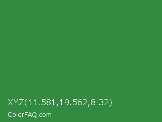 XYZ 11.581,19.562,8.32 Color is a normal green color and the nearest color is Sea Green #2e8b57. Hex code #338b42 and RGB value is rgb(51,139,66). In RGB color space, this color is composed of 20% red, 55% green, 26% blue, In CMYK color space, this color is composed of 63% cyan, 0% magenta, 53% yellow , 45% black , In HSL color space, this color has a hue angle of 130° , 46% saturation and 37% lightness.