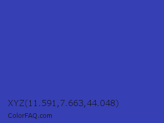 XYZ 11.591,7.663,44.048 Color is a normal blue color and the nearest color is Governor Bay #2f3cb3. Hex code #373fb4 and RGB value is rgb(55,63,180). In RGB color space, this color is composed of 22% red, 25% green, 71% blue, In CMYK color space, this color is composed of 69% cyan, 65% magenta, 0% yellow , 29% black , In HSL color space, this color has a hue angle of 236° , 53% saturation and 46% lightness.
