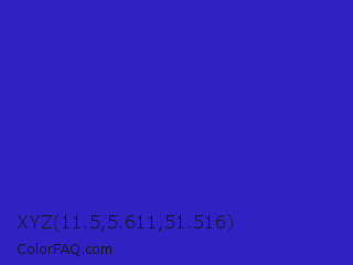 XYZ 11.5,5.611,51.516 Color is a normal indigo color and the nearest color is Interdimensional Blue #360ccc. Hex code #3021c2 and RGB value is rgb(48,33,194). In RGB color space, this color is composed of 19% red, 13% green, 76% blue, In CMYK color space, this color is composed of 75% cyan, 83% magenta, 0% yellow , 24% black , In HSL color space, this color has a hue angle of 246° , 71% saturation and 45% lightness.