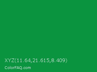 XYZ 11.64,21.615,8.409 Color is a normal green color and the nearest color is North Texas Green #059033. Hex code #0a9440 and RGB value is rgb(10,148,64). In RGB color space, this color is composed of 4% red, 58% green, 25% blue, In CMYK color space, this color is composed of 93% cyan, 0% magenta, 57% yellow , 42% black , In HSL color space, this color has a hue angle of 143° , 87% saturation and 31% lightness.
