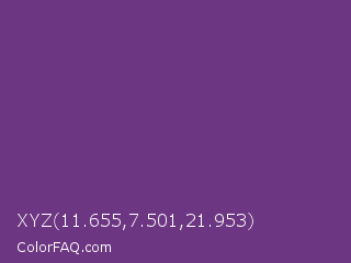 XYZ 11.655,7.501,21.953 Color is a normal purple color and the nearest color is Eminence #6c3082. Hex code #6d3682 and RGB value is rgb(109,54,130). In RGB color space, this color is composed of 43% red, 21% green, 51% blue, In CMYK color space, this color is composed of 16% cyan, 58% magenta, 0% yellow , 49% black , In HSL color space, this color has a hue angle of 283° , 41% saturation and 36% lightness.