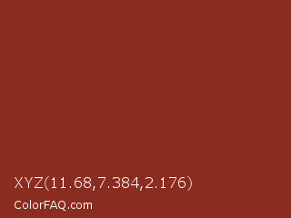 XYZ 11.68,7.384,2.176 Color is a normal red color and the nearest color is Burnt Umber #8a3324. Hex code #8a2d20 and RGB value is rgb(138,45,32). In RGB color space, this color is composed of 54% red, 18% green, 13% blue, In CMYK color space, this color is composed of 0% cyan, 67% magenta, 77% yellow , 46% black , In HSL color space, this color has a hue angle of 7° , 62% saturation and 33% lightness.