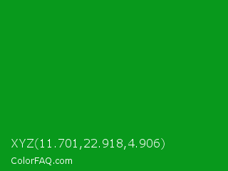 XYZ 11.701,22.918,4.906 Color is a normal green color and the nearest color is North Texas Green #059033. Hex code #08991c and RGB value is rgb(8,153,28). In RGB color space, this color is composed of 3% red, 60% green, 11% blue, In CMYK color space, this color is composed of 95% cyan, 0% magenta, 82% yellow , 40% black , In HSL color space, this color has a hue angle of 128° , 90% saturation and 32% lightness.